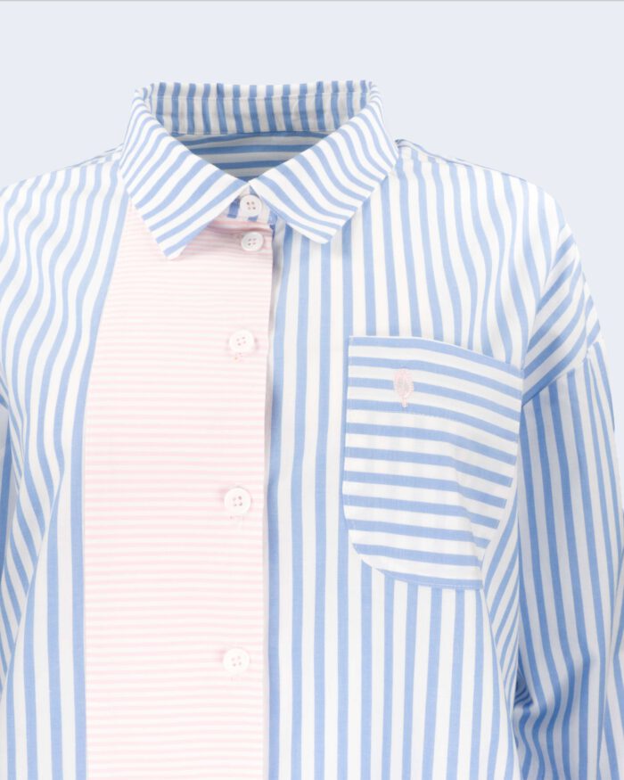 Gefertigt aus hochwertiger Bio-Baumwolle (kbA), steht sie für bewusst-gewählte Materialien und zeitlose Qualität. Das feine blau-weiße Streifenbild wird durch eine extrabreite Knopfleiste in rosé-weiß gestreiftem Popeline gebrochen – quer verarbeitet als subtiler Kontrast mit künstlerischem Charakter.